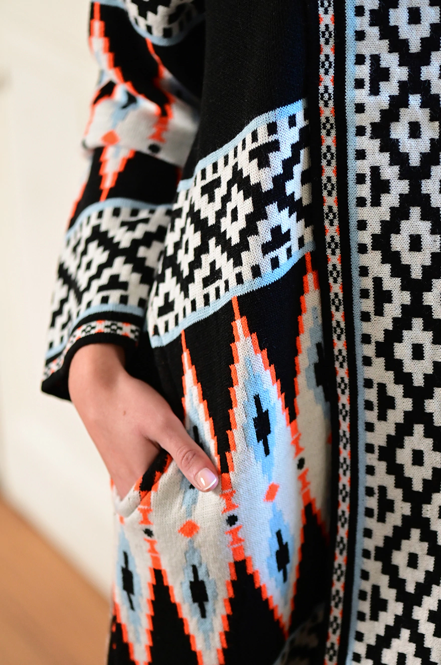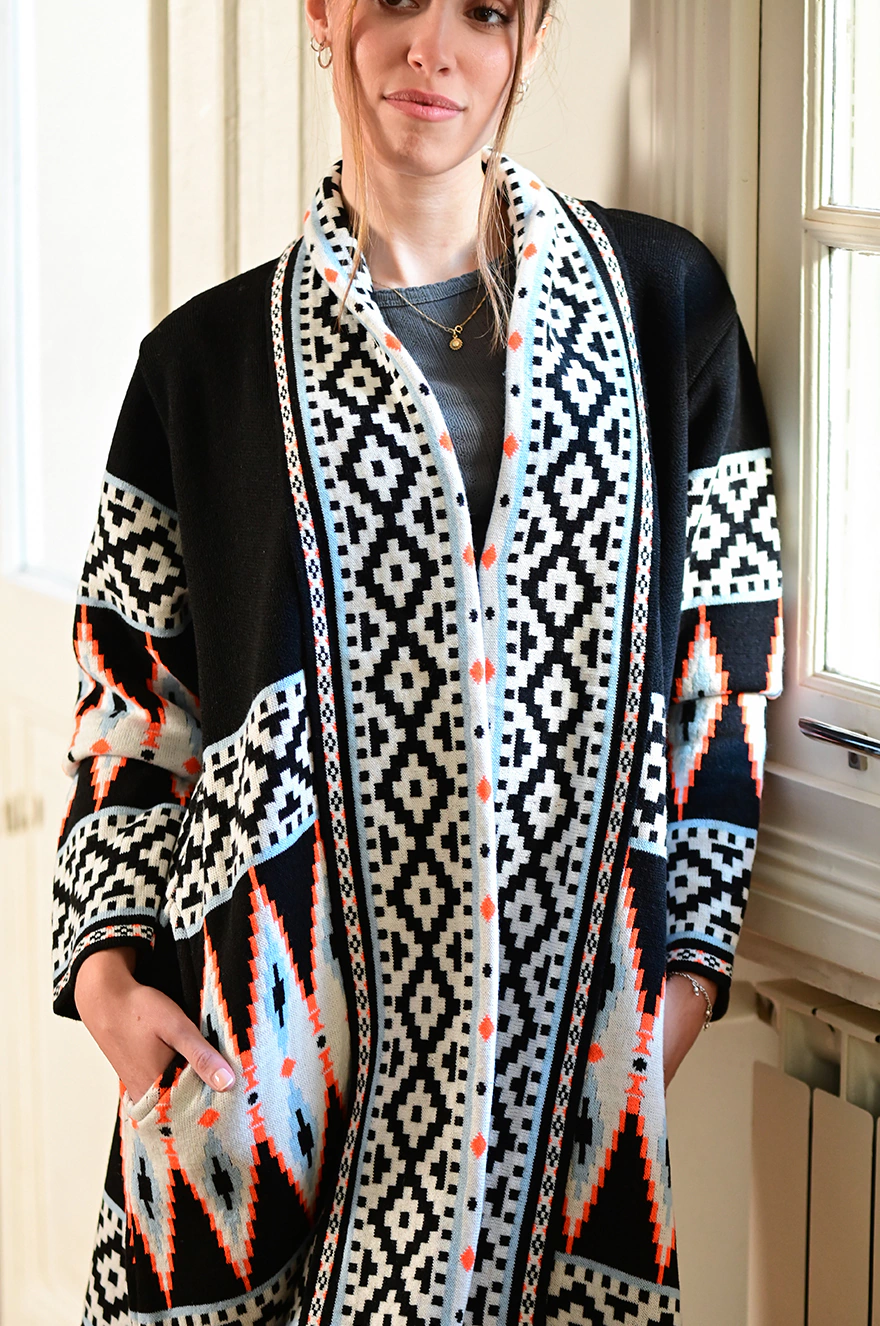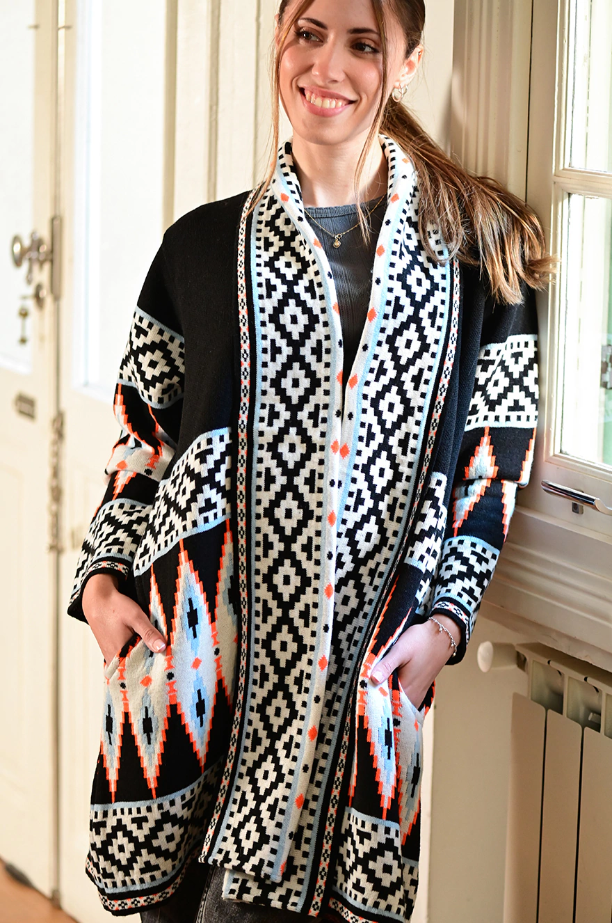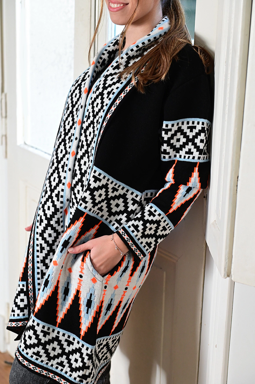 Este saco presenta un molde evasé con una tira de cuello ancha, que aporta un diseño moderno y femenino. Su largo de 85 cm ofrece una caída favorecedora, ideal para usar tanto con looks casuales como más formales.