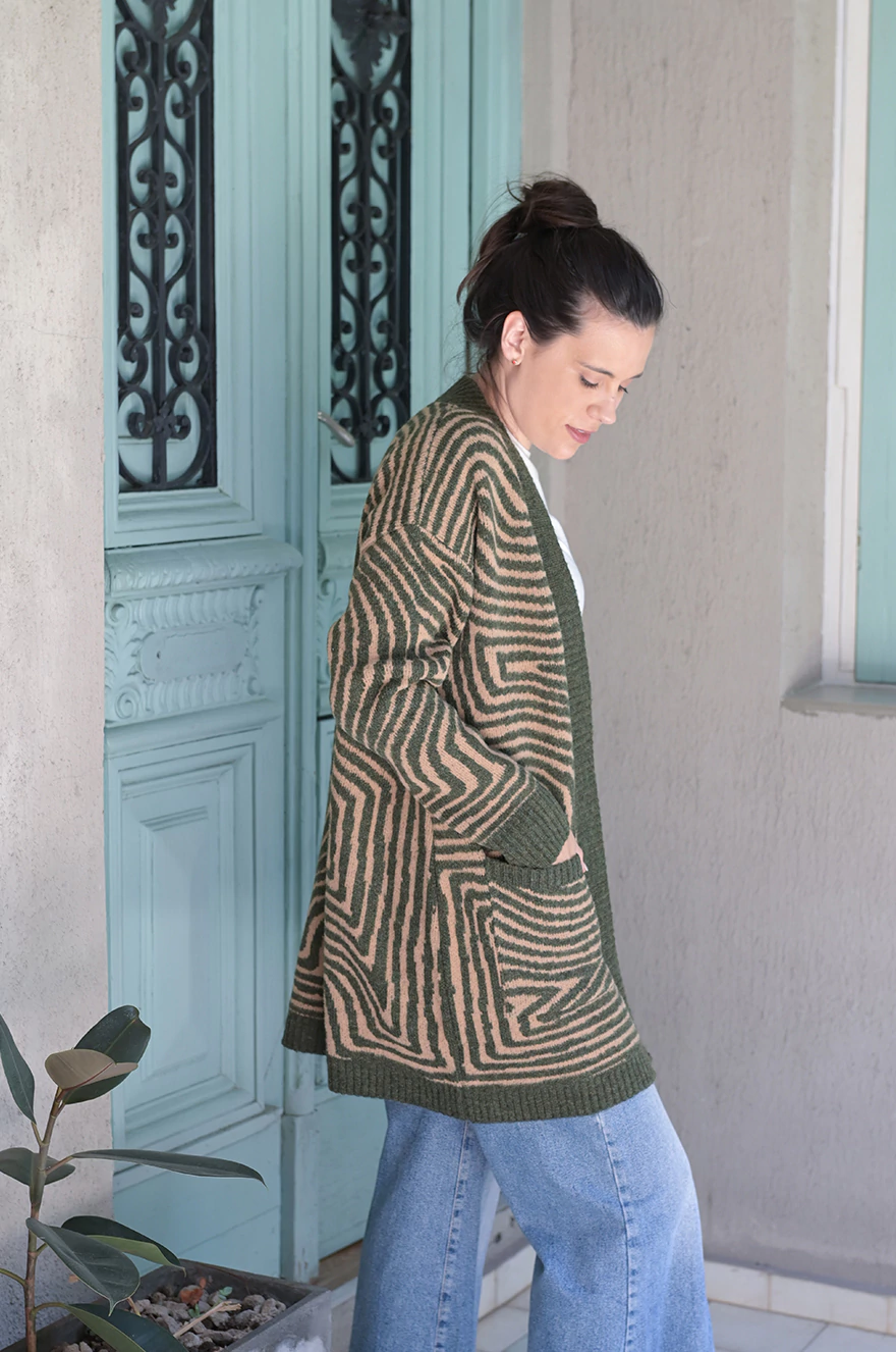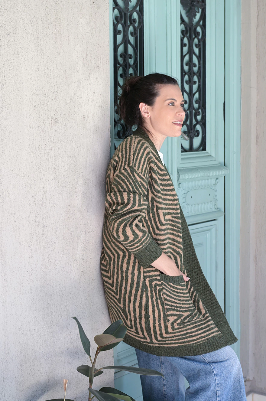 Con una moldería recta que favorece tu figura y prácticos bolsillos plaqué, este sacón ofrece comodidad y versatilidad. Su diseño con abstractos en dos colores aporta un toque moderno que realza cualquier look.