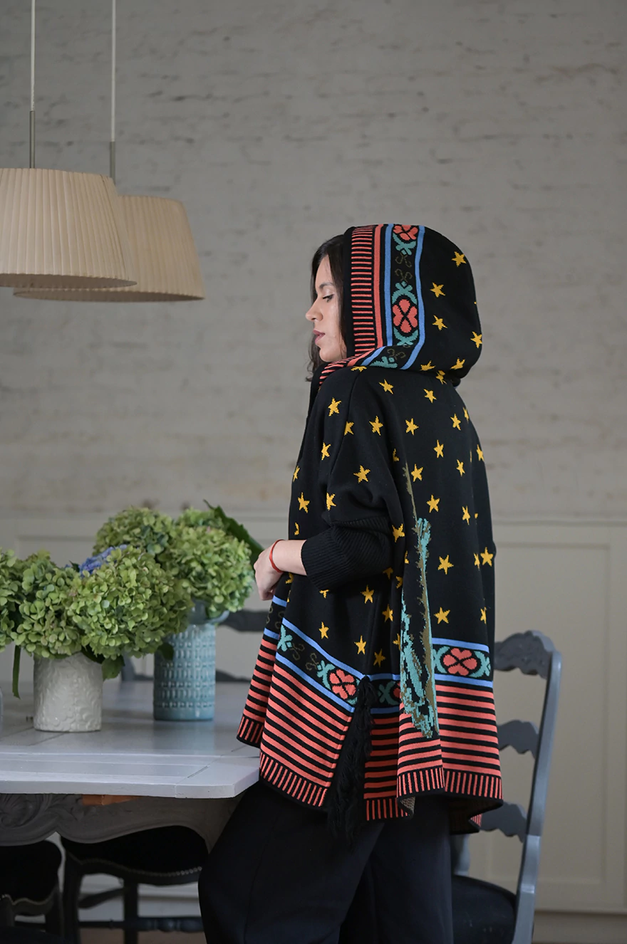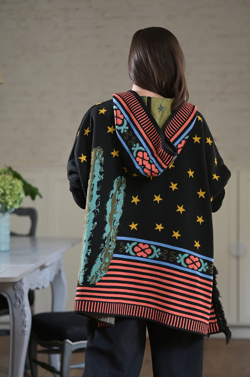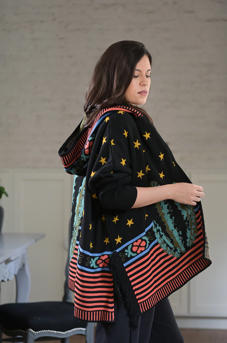 Saco Benito Cactus con capucha, ideal para los días frescos donde buscas comodidad y estilo. Presenta un molde cuadrado, con mangas morley que brindan un ajuste cómodo y moderno. Los cortes a los costados acompañan la silueta, mientras que los flecos le aportan un detalle único y artesanal.