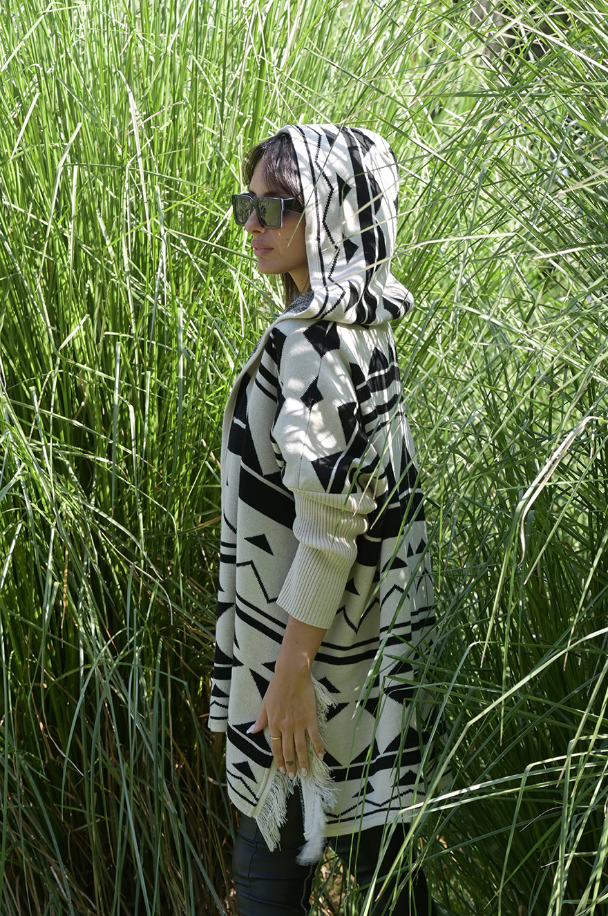 Descubre el Saco Benito Geométrico, una prenda única que combina estilo y comodidad. Su molde recto y super holgado se adapta a diversas figuras, abarcando hasta 150 cm de contorno de busto. Con tajitos a los costados y flecos, este saco presenta un diseño moderno y atractivo.
