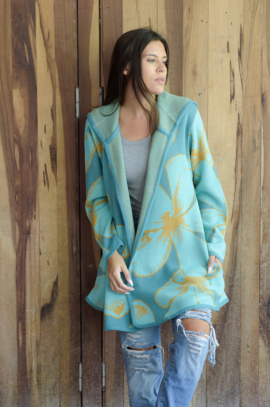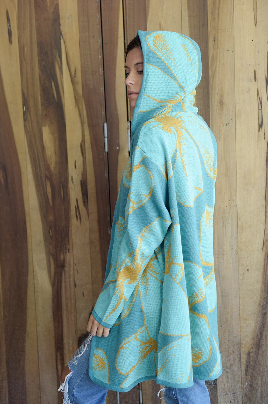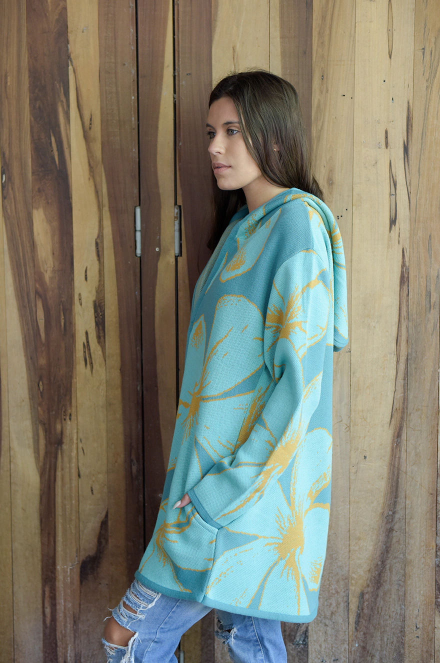 MOLDE: evasé, bolsillos escondidos a los costados, capucha amplia