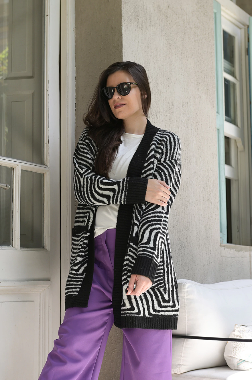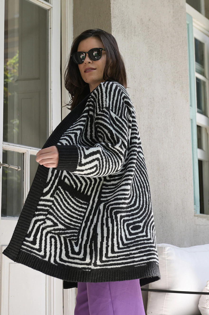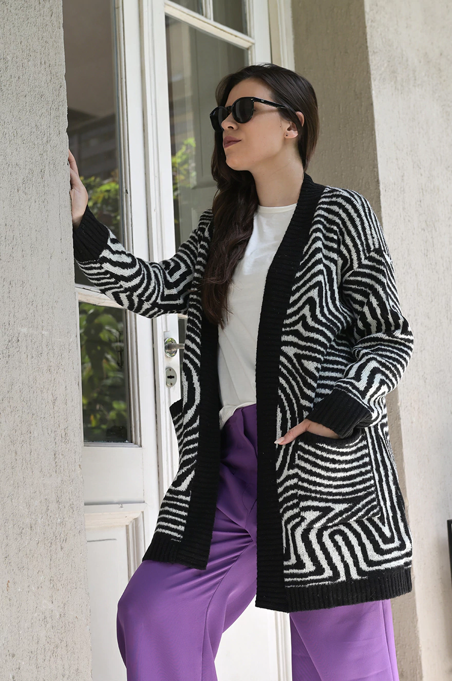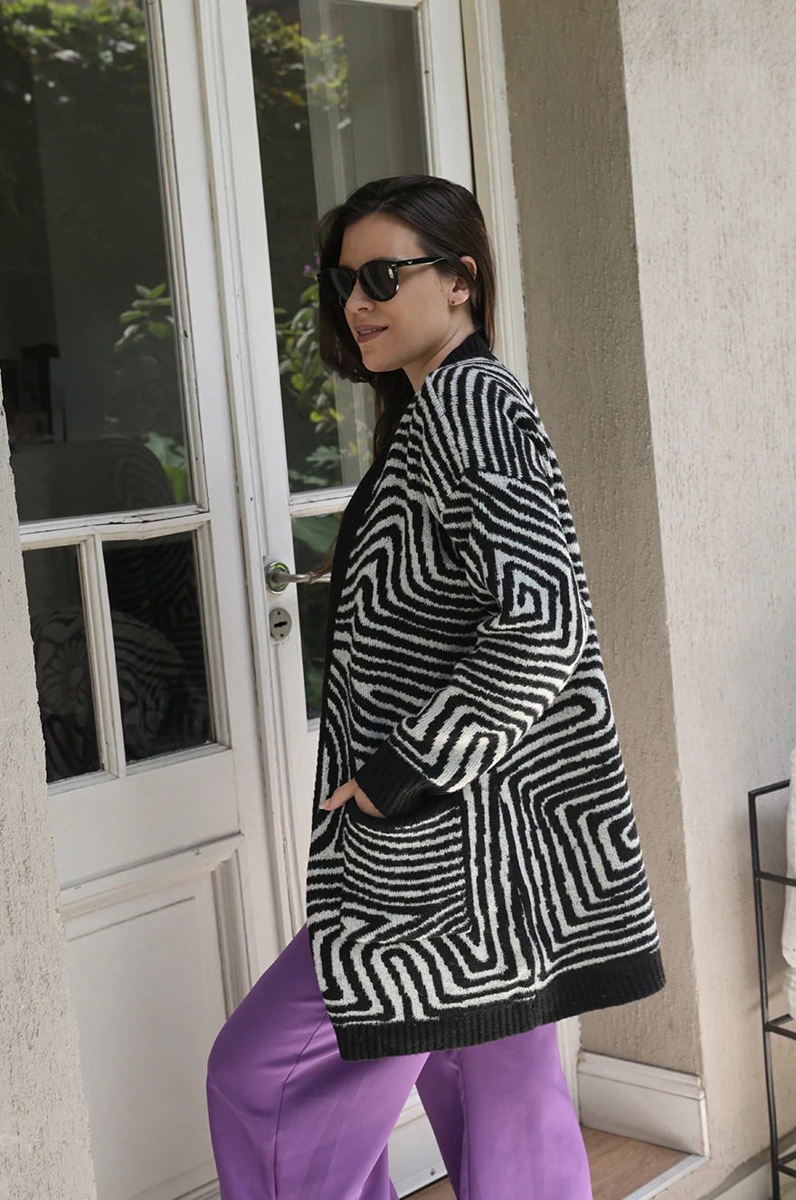 Con una moldería recta que favorece tu figura y prácticos bolsillos plaqué, este sacón ofrece comodidad y versatilidad. Su diseño con abstractos en dos colores aporta un toque moderno que realza cualquier look.