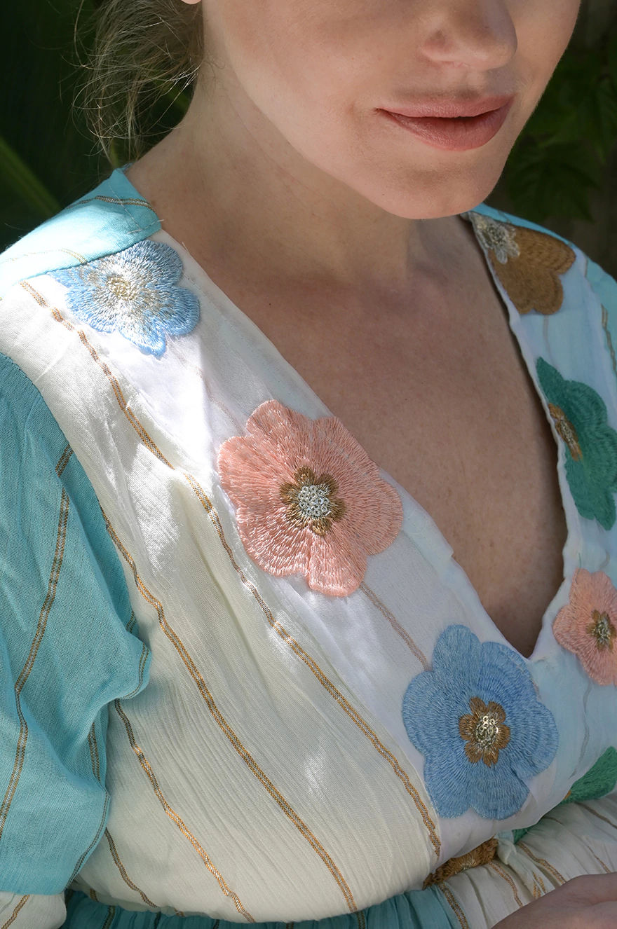 MOLDE: Vestido hindu corto con mangas largas y escote en V, que resalta tu elegancia natural. Cuenta con un canesú bordado que le aporta un detalle artesanal y delicado. Además, posee un elástico bajo el busto con lazo para ajustar y lograr un calce perfecto.