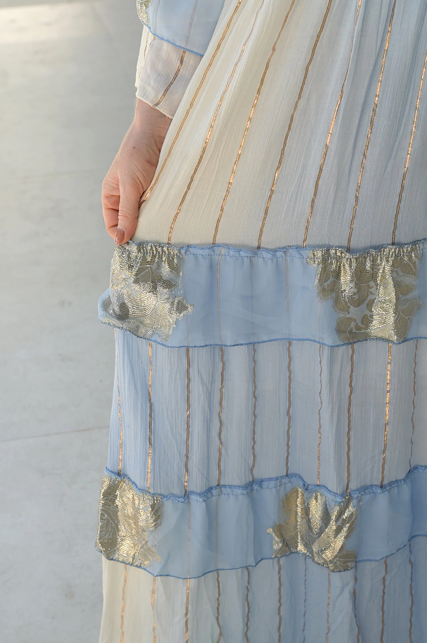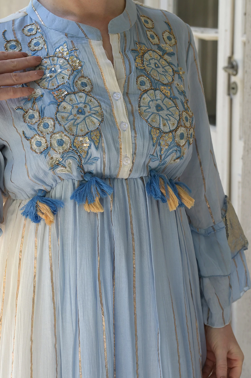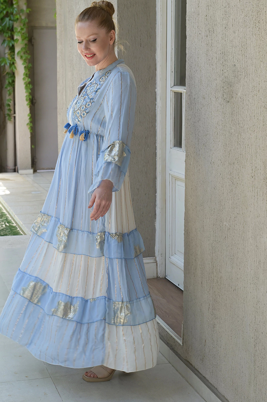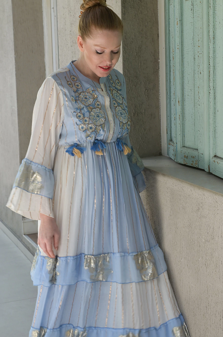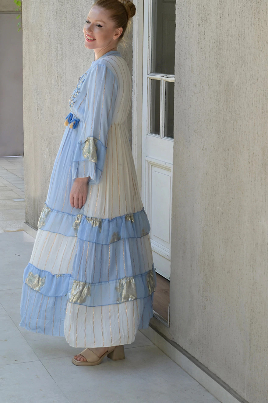 MOLDE: Vestido largo de estilo hindu, con mangas largas y volados que aportan un movimiento delicado y elegante. Presenta un cuello mao con una abertura frontal decorada con pequeños botones, además de un canezu bordado y detalles en borlas que realzan su sofisticación. La falda tiene un vuelo amplio que brinda comodidad y libertad.