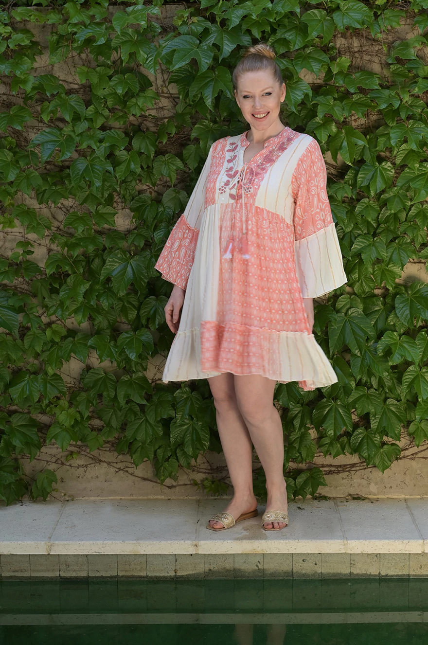 MOLDE: vestido hindu corto con un delicado escote en V y cuello mao que aporta un estilo único y sofisticado. Cuenta con manga larga y un elástico en el bajo busto acompañado de un lazo para ajustar a tu medida. Destaca el canezú bordado en canutillos, que le da un toque artesanal y elegante.