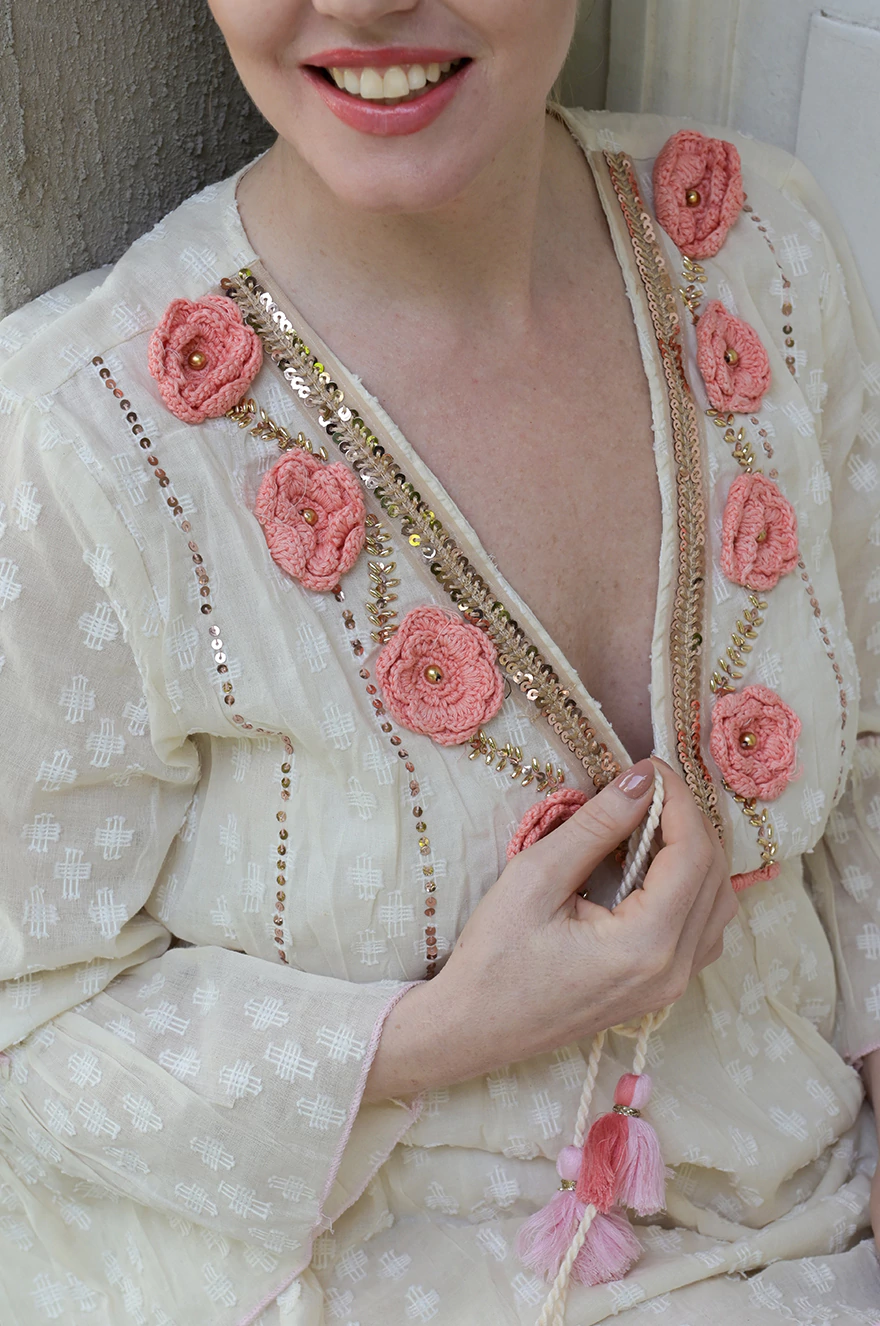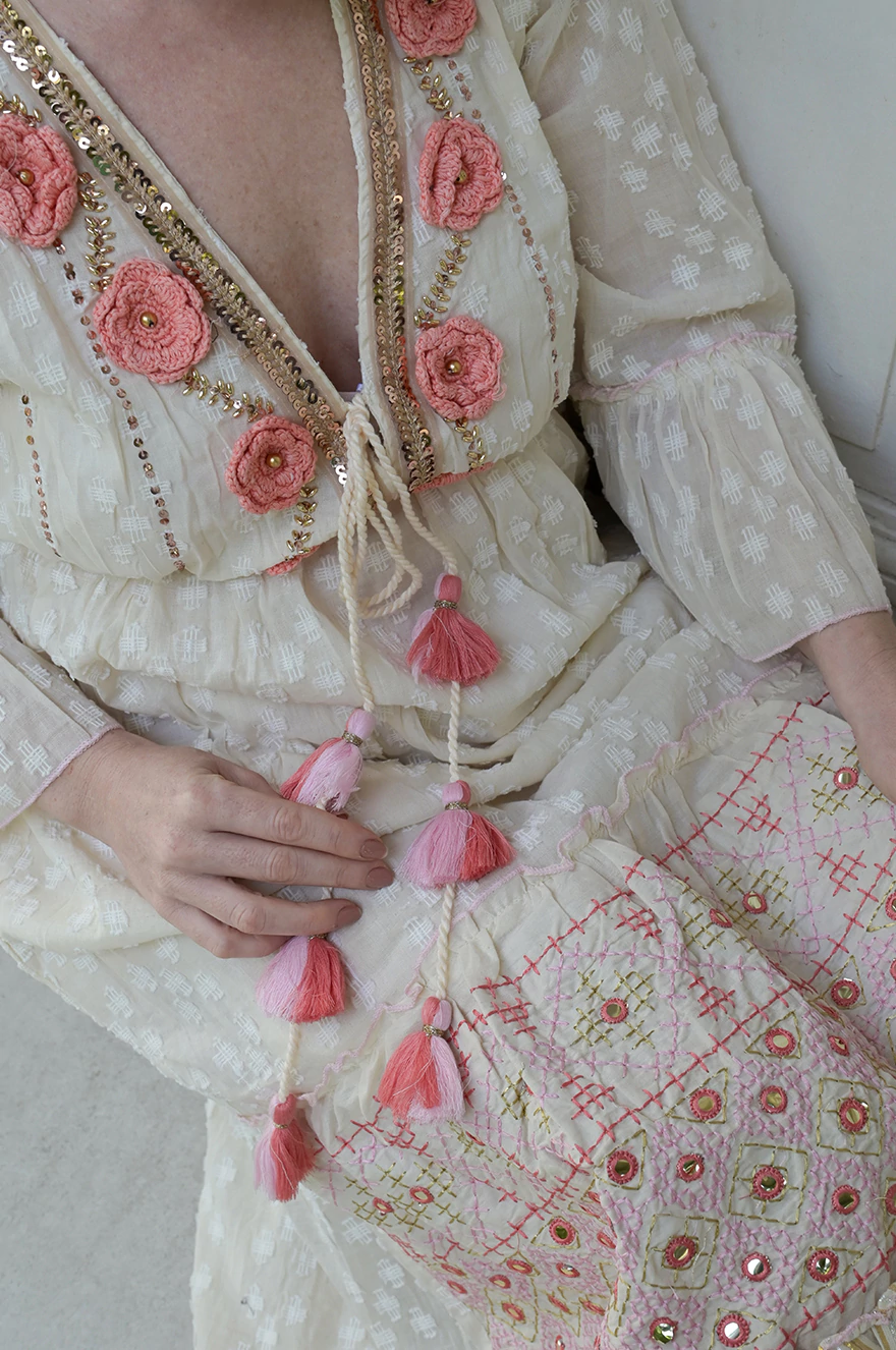 MOLDE: Vestido largo estilo hindú, con mangas largas y un delicado escote en V adornado con flores tejidas al crochet. Presenta un frunce debajo del busto con elástico y un lazo para ajustar, que realza la figura de manera sutil y cómoda.